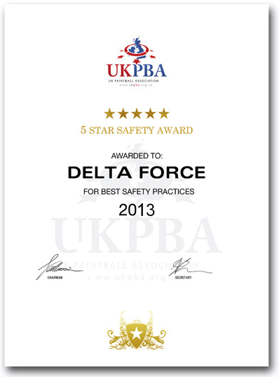 The UKPBA, Great Britain’s leading authority on all things paintball, have for the twentieth year running awarded Delta Force Paintball with a five-star safety accreditation, in recognition of the company’s dedication to quality safety practices and modern facilities! Working in unison with UKPBA has led to fantastic advancements in equipment reliability, customer satisfaction, quality consistencyat every centre and many other essential values that has made Delta Force Paintball the most trusted name in the industry.